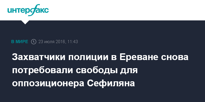Москва. 23 июля. INTERFAX.RU - Захватившие в Ереване отделение полиции и заложников вооруженные радикалы настаивают на освобождении координатора оппозиционной гражданской инициативы "Учредительный парламент" Жирайра Сефиляна, находящегося под арестом по обвинению в незаконном приобретении и хранении оружия, а также других лиц, которых они считают политзаключенными.