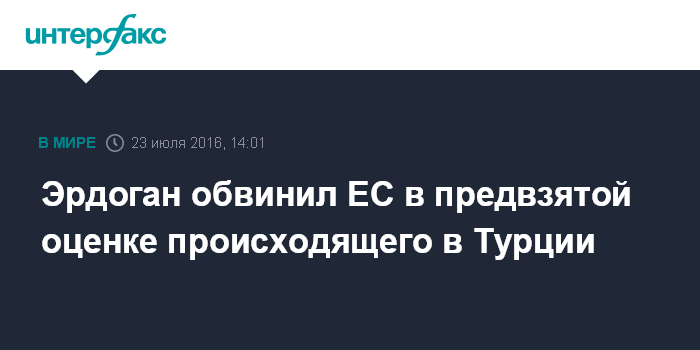 Москва. 23 июля. INTERFAX.RU - Президент Турции Реджеп Тайип Эрдоган заявил, что считает предвзятой критику ЕС его действий в ответ на попытку военного переворота.