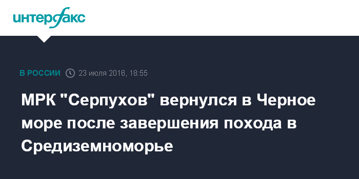 Москва. 23 июля. INTERFAX.RU - Малый ракетный корабль Черноморского флота "Серпухов" в субботу вернулся в Черное море, завершив несение боевого дежурства близ побережья Сирии, сообщили турецкие информационные порталы, публикующие фотографии его прохождения через пролив Босфор.