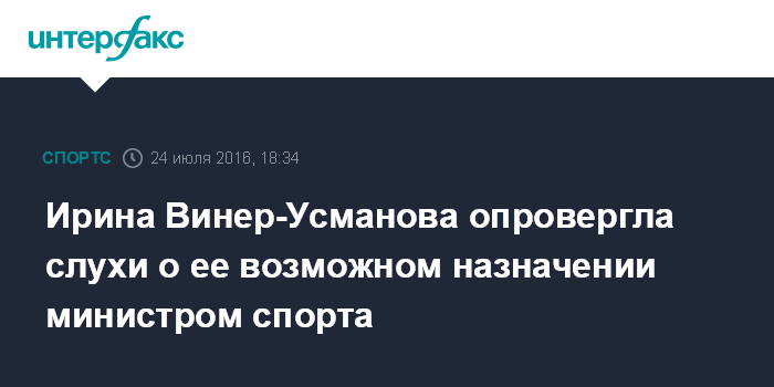 Москва. 24 июля. INTERFAX.RU - Президент Всероссийской федерации художественной гимнастики Ирина Винер-Усманова заявила, что у нее нет намерения занимать пост министра спорта РФ и что такой вопрос не стоял и никогда с ней не обсуждался.