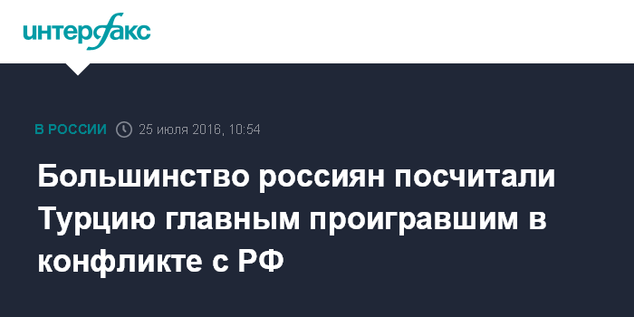 Москва. 25 июля. INTERFAX.RU - Большинство россиян полагают, что в результате конфликта с Турцией больше проиграла Турция (61%), чем Россия (4%). Менее трети полагают, что потеряли в равной степени обе стороны (27%). Еще 8% затруднились с ответом.