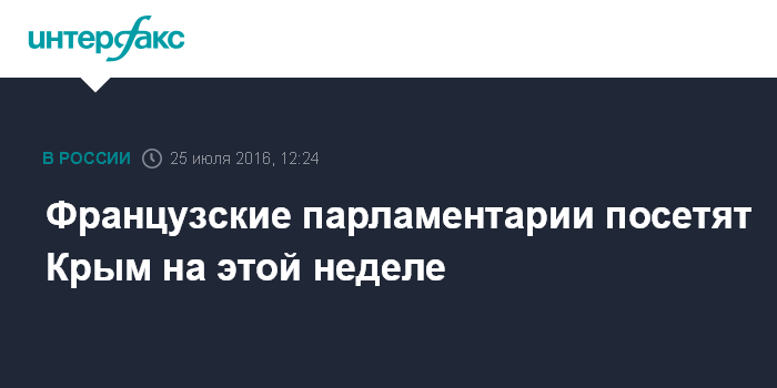 Москва. 25 июля. INTERFAX.RU - Делегация депутатов Национального собрания и членов Сената Франции посетит Крым 29-31 июля, примет участие в праздновании Дня ВМФ РФ в Севастополе, сообщил в понедельник пресс-центр Государственного совета республики.
