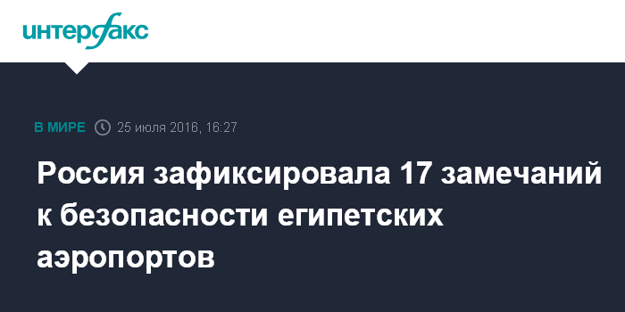 Москва. 25 июля. INTERFAX.RU - Российские специалисты зафиксировали 17 замечаний к обеспечению безопасности в египетских аэропортах, сообщил глава Минтранса РФ Максим Соколов журналистам в Севастополе.