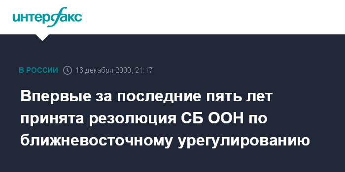 Москва. 16 декабря. INTERFAX.RU - Совет Безопасности (СБ) ООН принял новую резолюцию по ближневосточному урегулированию, в которой израильская и палестинские стороны призываются к переговорам, а также выражается поддержка проведения международной встречи по Ближнем Востоку в Москве в 2009 году.