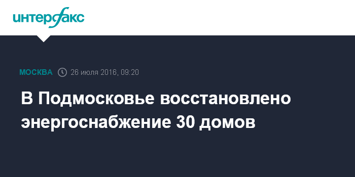 Москва. 26 июля. INTERFAX.RU - Восстановлено энергоснабжение в Павлово-Посадском районе Подмосковья, где в понедельник вечером из-за поваленных деревьев остались без света около 30 домов, сообщается во вторник на сайте МЧС России по Московской области.