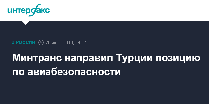 Москва. 26 июля. INTERFAX.RU - Министерство транспорта РФ направило турецкой стороне позицию по дополнительным мерам авиабезопасности, сообщил журналистам министр транспорта РФ Максим Соколов.