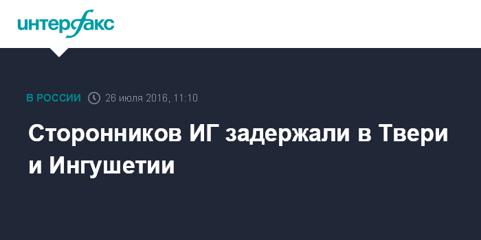 Москва. 26 июля. INTERFAX.RU - Сотрудники полиции совместно с ФСБ задержали сторонников ИГ (организация запрещена в РФ) в Твери и Ингушетии, сообщила "Интерфаксу" официальный представитель МВД Ирина Волк.