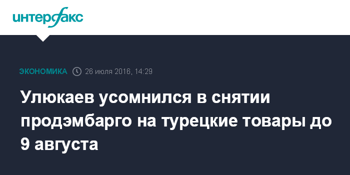 Москва. 26 июля. INTERFAX.RU - Продовольственное эмбарго на турецкие товары вряд ли будет снято до встречи президентов России и Турции в августе, заявил глава Минэкономразвития Алексей Улюкаев по итогам встречи со своим турецким коллегой Нихатом Зейбекчи.