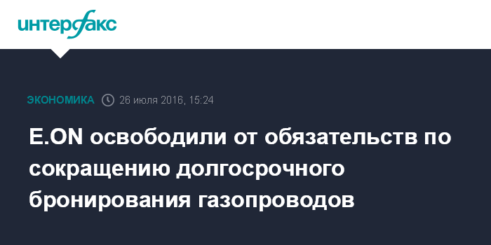 Москва. 26 июля. INTERFAX.RU - Еврокомиссия почти на пять лет раньше установленного срока сняла с германской газовой компании E.ON обязательства по сокращению доли газа, поступающего на рынок Германии на основе долгосрочного бронирования трубопроводных мощностей.