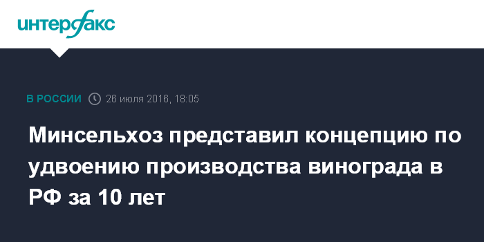 Москва. 26 июля. INTERFAX.RU - Россия к 2025 году может довести производство винограда до 919,2 тыс. тонн, что почти в два раза больше, чем в 2015 году (475,2 тыс. тонн). Как сообщает Минсельхоз, это предусмотрено проектом концепции развития виноградарства и виноделия в РФ на период 2016-2020 годов и плановый период до 2025 года, который разработало ведомство.