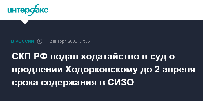 СКП РФ подал ходатайство в суд о продлении Ходорковскому до 2 апреля срока содержания в СИЗО