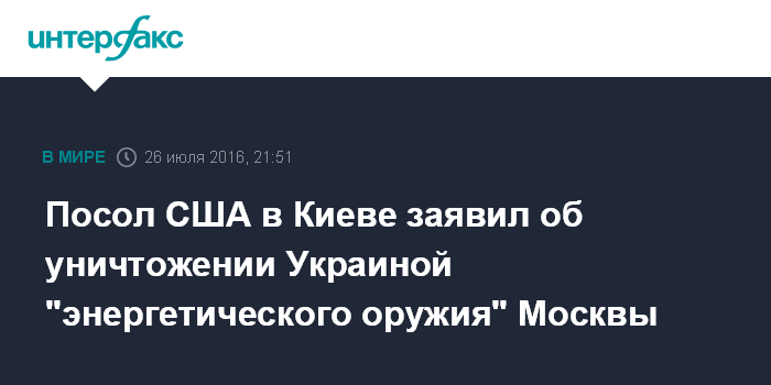 Москва. 26 июля. INTERFAX.RU - Официальному Киеву удалось избавиться от зависимости от РФ в поставках газа, тем самым уничтожив "энергетическое оружие" Кремля, заявляет посол США на Украине Джеффри Пайетт.