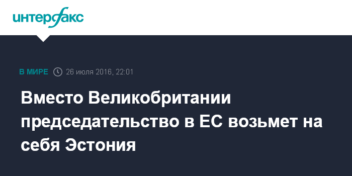 Москва. 26 июля. INTERFAX.RU - Эстония во второй половине 2017 года возглавит Европейский союз вместо Великобритании, сообщил во вторник премьер-министр Эстонии Таави Рыйвас.