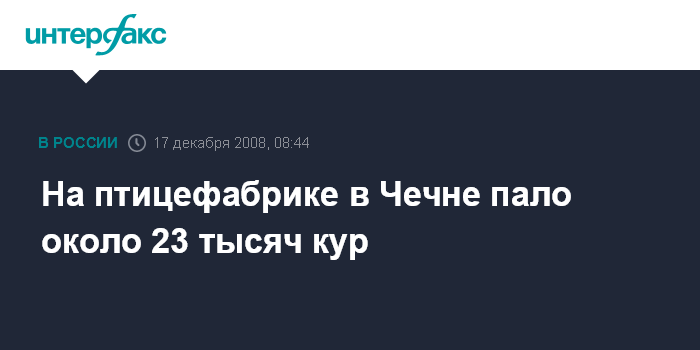 Москва. 17 декабря. INTERFAX.RU - Массовый падеж птицы зарегистрирован на Старо-Юртовской птицефабрике в чеченском селении Толстой-Юрт. "В минувший вторник на Старо-Юртовской птицефабрике был отмечен падеж 22 тыс. 930 кур", - сообщили агентству "Интерфакс-Юг" в среду в пресс-службе Южного регионального центра МЧС РФ.