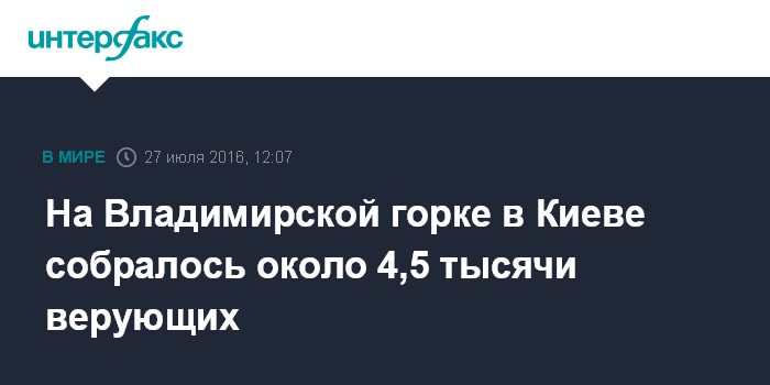 Москва. 27 июля. INTERFAX.RU - Около 4,5 тыс. верующих в настоящее время собрались на молебен на Владимирской горке в Киеве, грубых нарушений правопорядка нет, сообщает отдел коммуникации полиции Киева.