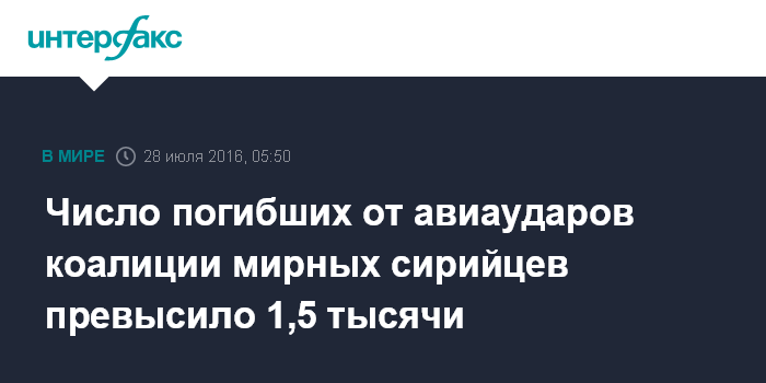 Москва. 28 июля. INTERFAX.RU - В результате авиаударов руководимой США международной коалиции против "Исламского государства" (ИГ, группировка запрещена в РФ) по территории Сирии погибли более 1,5 тыс. мирных жителей, сообщила неправительственная организация Airwars.