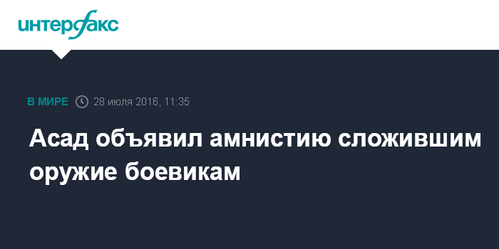 Москва. 28 июля. INTERFAX.RU - Президент Сирии Башар Асад объявил амнистию боевикам, которые сложат оружие и сдадутся в течение ближайших трех месяцев, сообщает Associate Press со ссылкой на агентство SANA.