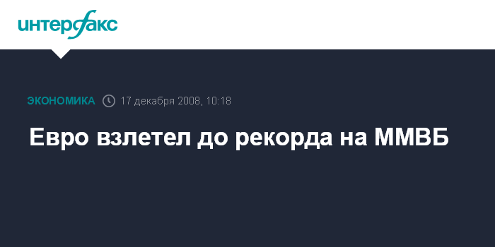 Москва. 17 декабря. INTERFAX.RU - Курс евро на ММВБ при открытии торгов в среду на сессии расчетами "завтра" взлетел до 38,57-38,65 руб./EUR1, на 70-78 копеек выше уровня закрытия предыдущего дня. Евро поднялся до исторического максимума к рублю. Предыдущий максимум держался около 4-х лет, был установлен в последний торговый день 2004 года и составлял 37,97 руб./EUR1.