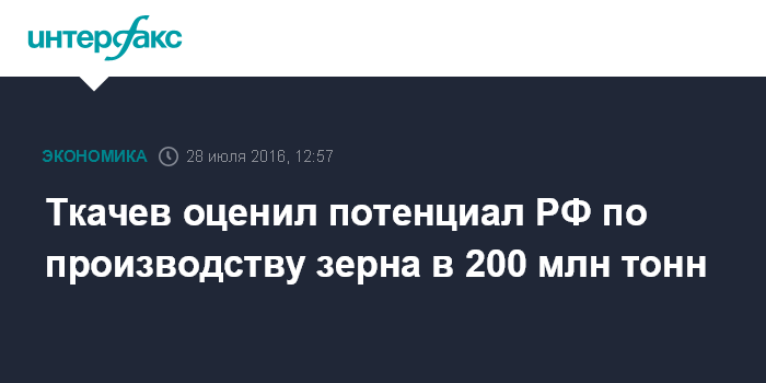 Москва. 28 июля. INTERFAX.RU - Годовой потенциал России по производству зерна составляет 200 млн тонн, считает глава Минсельхоза РФ Александр Ткачев