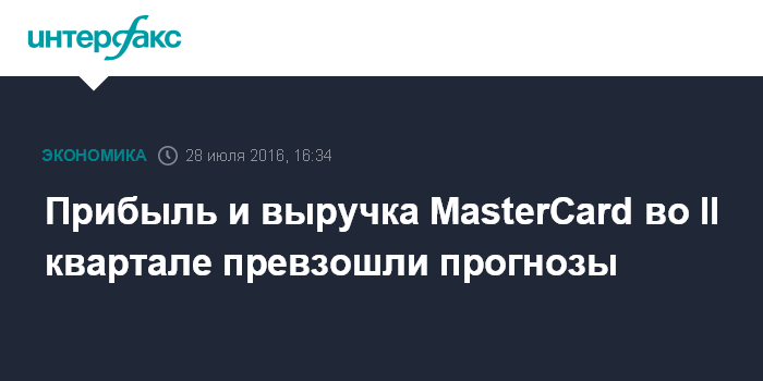 Москва. 28 июля. INTERFAX.RU - Американская MasterCard, вторая по величине платежная система в мире, увеличила чистую прибыль во втором квартале 2016 года на семь процентов, выручку - на 13%.