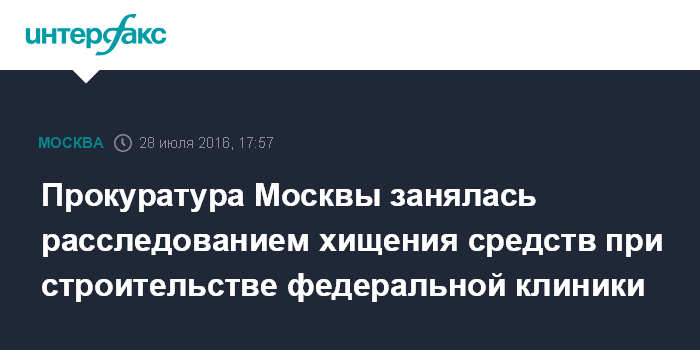 Москва. 28 июля. INTERFAX.RU - Правоохранительные органы расследует дело о хищении бюджетных средств, выделенных на реконструкцию медицинского центра на востоке Москвы, сообщила "Интерфаксу" официальный представитель столичной прокуратуры Елена Рассохина.