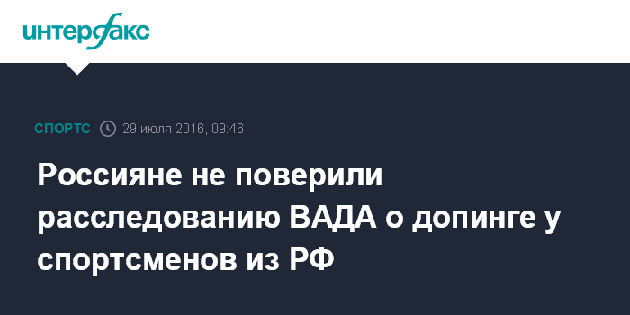 Москва. 29 июля. INTERFAX.RU - Большинство россиян не верят итогам расследования Всемирного антидопингового агентства (ВАДА), обвинившего российских участников Олимпиады в Сочи в употреблении запрещенных препаратов: 38% называют представленные доказательства "не слишком убедительными", 33% - "совершенно неубедительными", сообщили "Интерфаксу" в "Левада-Центре".