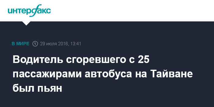 Москва. 29 июля. INTERFAX.RU - Водитель сгоревшего на Тайване туристического автобуса, в котором погибли 26 человек, находился в состоянии алкогольного опьянения, сообщило в пятницу агентство EFE со ссылкой на прокуратуру уезда Таоюань.