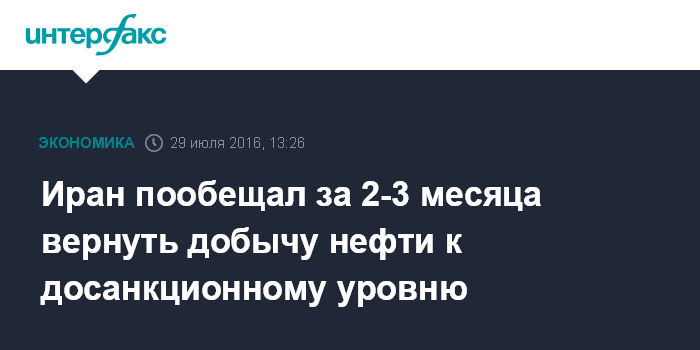 Москва. 29 июля. INTERFAX.RU - Иран сможет достичь досанкционного уровня добычи нефти через два -три месяца, сообщил журналистам министр связи и информационных технологий Ирана, сопредседатель межправительственной российско-иранской комиссии с иранской стороны Махмуд Ваэзи.