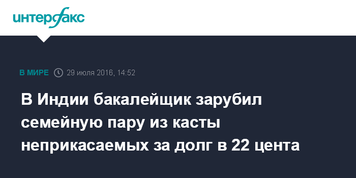 Москва. 29 июля. INTERFAX.RU - В Индии владелец бакалейной лавки зарубил топором семейной пару из касты неприкасаемых из-за долга в 15 рупий (22 цента), сообщает "Би-би-си".