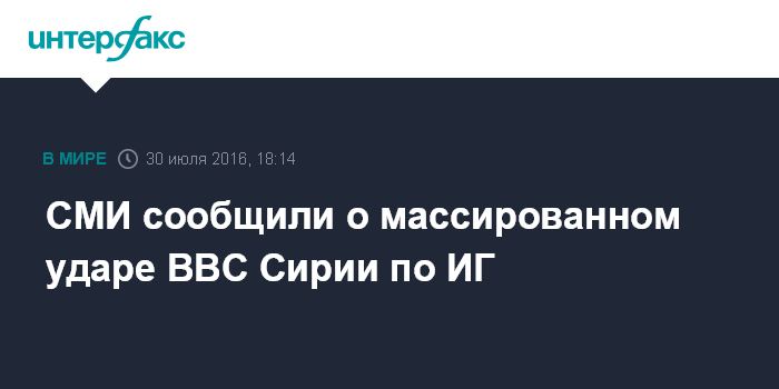 Москва. 30 июля. INTERFAX.RU - Сирийская авиация нанесла удары по боевикам террористической группировки ИГИЛ (запрещена в РФ) в двух провинциях, сообщило в субботу сирийское государственное агентство САНА.
