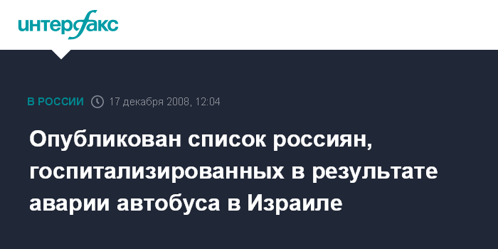 Москва. 17 декабря. INTERFAX.RU - МЧС России опубликовало список россиян, госпитализированных в результате крушения пассажирского автобуса в Израиле, сообщили "Интерфаксу" в Управлении информации министерства.