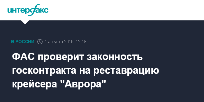 Москва. 1 августа. INTERFAX.RU - Управление Федеральной антимонопольной службы (УФАС) по Петербургу с понедельника начало проверку АО "Кронштадтский морской завод" (входит в АО "Объединенная судостроительная корпорация"), с которым был заключен госконтракт на ремонт крейсера "Аврора", сообщила пресс-служба УФАС.