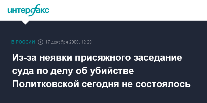 Москва. 17 декабря. INTERFAX.RU - На процесс по делу об убийстве обозревателя "Новой газеты" Анны Политковской не явился один присяжный, в связи с чем в суде был объявлен перерыв до четверга.