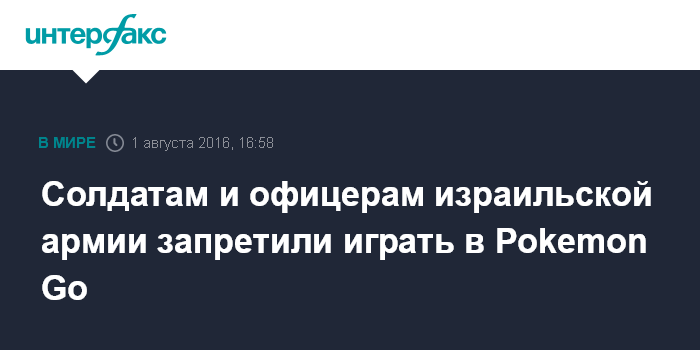 Москва. 1 августа. INTERFAX.RU - Командование израильской армии выпустило для служащих предупреждение о новой угрозе: широко распространенной игре Pokemon Go, сообщило в понедельник агентство The Associated Press.