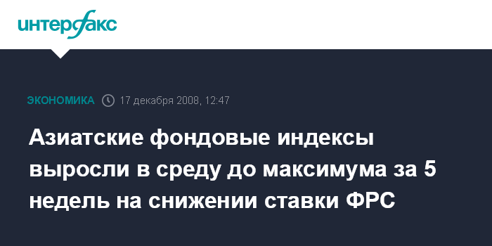 Москва. 17 декабря. INTERFAX.RU - Фондовые индексы Азиатско-Тихоокеанского региона поднялись в среду на новостях об уменьшении базовой процентной ставки Федеральной резервной системы (ФРС) до целевого диапазона от 0% до 0,25% годовых, сообщило агентство Bloomberg.