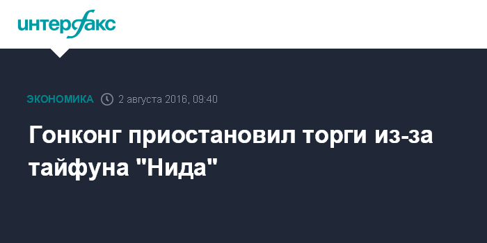 Москва. 2 августа. INTERFAX.RU - Оператор гонконгских биржевых площадок Hong Kong Exchanges & Clearing Ltd. объявил о приостановке операций во вторник на один день, включая торги фьючерсами, из-за тайфуна "Нида".