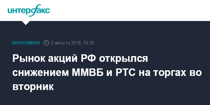Москва. 2 августа. INTERFAX.RU - Рынок акций РФ открылся во вторник снижением цен blue chips на фоне негативной внешней фондовой конъюнктуры и слабой нефти, индексы ММВБ и РТС за минуту торгов просели на 0,2-0,7%.