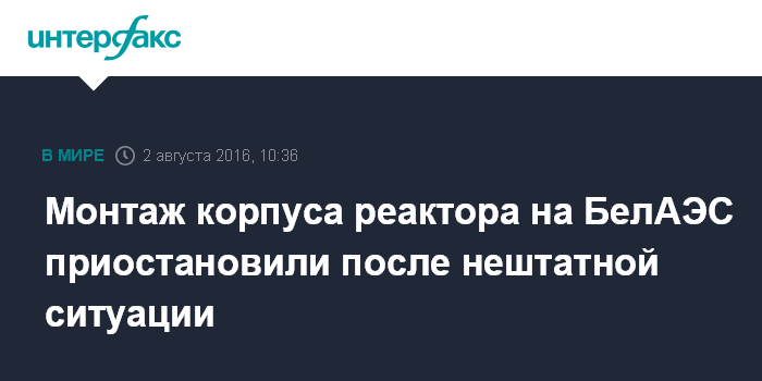 Москва. 2 августа. INTERFAX.RU - Монтаж корпуса реактора на первом энергоблоке Белорусской АЭС после нештатной ситуации приостановлен, остальные работы ведутся в штатном режиме, сообщил заместитель министра энергетики Белоруссии Михаил Михадюк журналистам в понедельник в Минске.