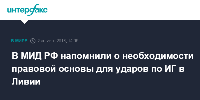 Москва. 2 августа. INTERFAX.RU - Авиаудары по позициям ИГИЛ (террористическая организация, запрещенная в РФ) в Ливии должны вестись в строгом соответствии с международным правом. Об этом говорится в комментарии департамента информации и печати МИД РФ в связи с бомбардировками американскими ВВС позиций террористов в этой стране.