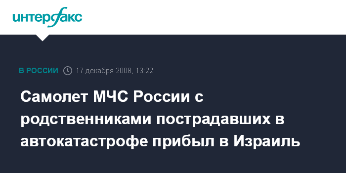 Москва. 17 декабря. INTERFAX.RU - Самолет МЧС РФ ЯК-42 прибыл в Израиль. В 12:40 мск самолет приземлился в аэропорту Тель-Авива. На его борту родственники и близкие пострадавших в ДТП в Израиле россиян. С ними прибыли также психологи Центра экстренной психологической помощи МЧС, сообщили в среду "Интерфаксу" в управлении информации МЧС России.