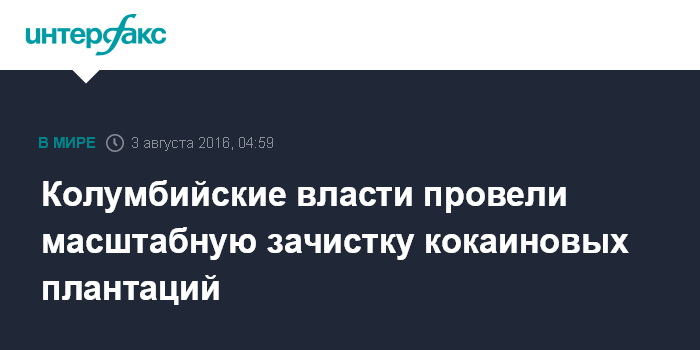 Москва. 3 августа. INTERFAX.RU - Силы безопасности Колумбии провели операцию по уничтожению 104 лабораторий по производству кокаина на юго-востоке страны, сообщает BBC.