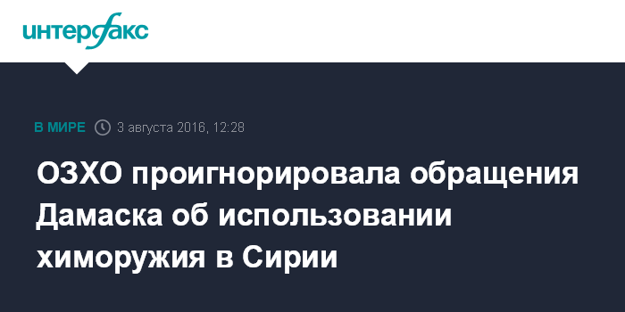 Москва. 3 августа. INTERFAX.RU - В Москве возмущены отсутствием реакции со стороны Организации по запрещению химического оружия (ОЗХО) на обращения Дамаска относительно использования химоружия в Сирии, сообщили в МИД РФ.
