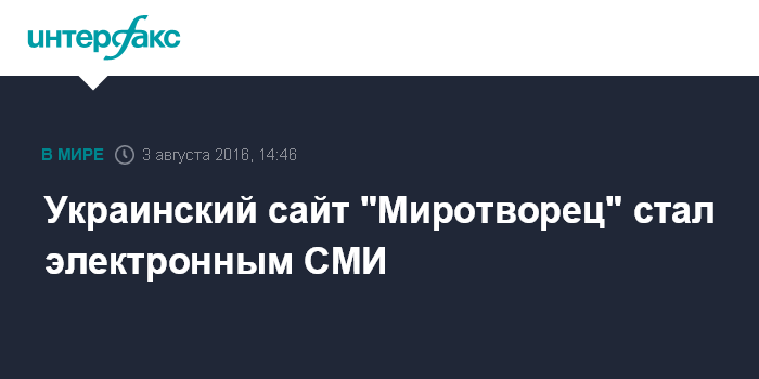 Москва. 3 августа. INTERFAX.RU - Интернет-проект "Миротворец" со среды, 3 августа, становится электронным средством массовой информации. Об этом сообщил народный депутат украинской Рады из фракции "Народный фронт", советник главы МВД Украины Антон Геращенко.