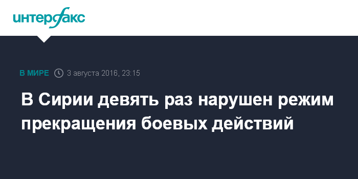 Москва. 3 августа. INTERFAX.RU -Режим прекращения боевых действий в течение суток соблюдался в большинстве провинций Сирийской Арабской Республики (САР), за сутки зафиксировано 9 нарушений в провинциях Дамаск, Латакия и Хама.