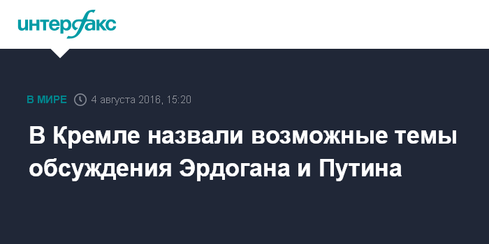 Москва. 4 августа. INTERFAX.RU - Президент РФ Владимир Путин и президент Турции Реджеп Тайип Эрдоган, как ожидается, обсудят темпы реставрации двусторонних отношений, а также ситуацию вокруг Сирии, сообщил пресс-секретарь президента РФ Дмитрий Песков.