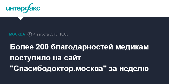 Москва. 4 августа. INTERFAX.RU - Более 200 историй благодарности московским медикам поступило через сайт спасибодоктор.москва менее чем за неделю с момента его открытия, сообщает Департамент здравоохранения Москвы.