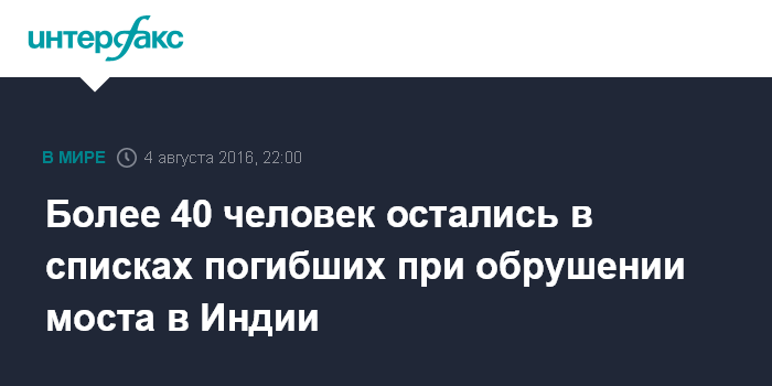 Москва. 4 августа. INTERFAX.RU - Не менее 42 человек, вероятно, погибли в результате обрушения моста в индийском штате Махараштра, пишет в четверг газета Hindustan Times.