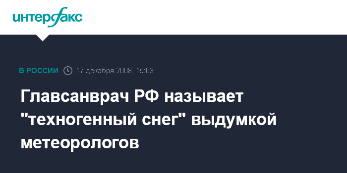 Москва. 17 декабря. INTERFAX.RU - Так называемый техногенный снег, выпавший недавно в Москве, - выдумка метеорологов, считает главный государственный санитарный врач России Геннадий Онищенко.