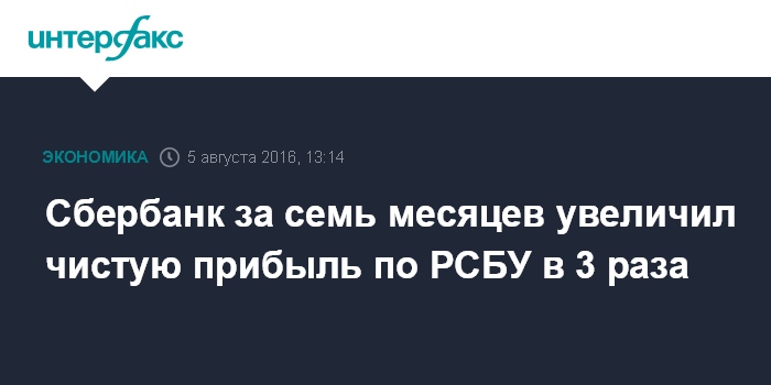 Москва. 5 августа. INTERFAX.RU - Сбербанк России в январе-июле 2016 года увеличил чистую прибыль по российским стандартам бухучета (РСБУ) в три раза - до 275 млрд рублей, говорится в пресс-релизе банка.
