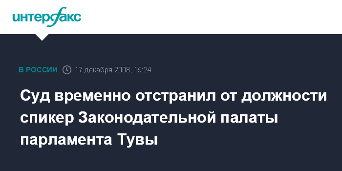 Москва. 17 декабря. INTERFAX.RU - Городской суд Кызыла постановил в среду временно отстранить от должности спикера Законодательной палаты Великого Хурала (парламента) Республики Тува Василия Оюна, подозреваемого в превышении полномочий.